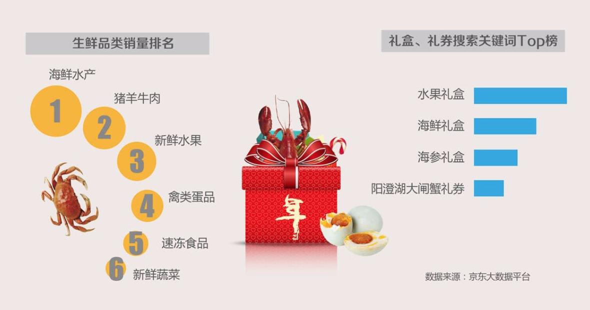 中国有句俗话说得好“民以食为天”。随着国人消费能力、生活水平的逐步提升,人们饮食结构及理念随之发生着翻天覆地的变化。 2月15日,京东携手21世纪经济研究院联合发布《“吃出来的中国年”——生鲜年货电商消费趋势报告》,通过对生鲜年货电商消费行为的综合比对分析,深度剖析“鲜”年货走俏背后蕴含的饮食结构变化,追求健康和高品质让高蛋白食材、进口商品备受追捧。 高蛋白食材增速高,健康观念普遍提升 随着我国经济体量的不断增长,国人的生活水平得到全面提升,我们的饮食结构也发生着翻天覆地的变化。人们不再只选择高油高脂的食物,而是越来越往精细化、健康化方向转变。报告中显示,海鲜水产超过肉类成为春节期间销量第一名,而观察全国消费者偏爱的生鲜品类发现,北京、上海、广东、内蒙古、吉林、青海等不同地区的消费者在购买生鲜产品时,新鲜水果、虾类、牛肉也均排名前列。
