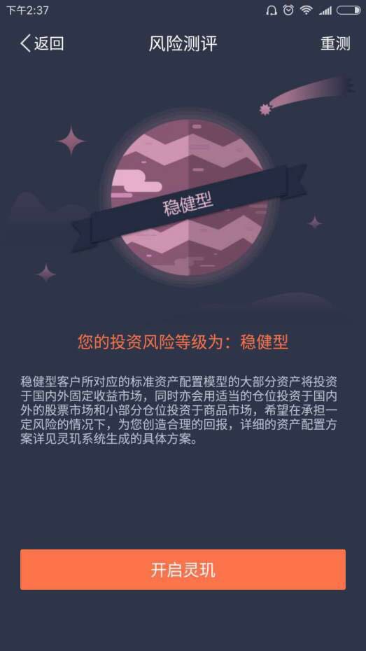 通过一系列问题的风险测评,得出菜导的风险偏好类型为:稳健型。