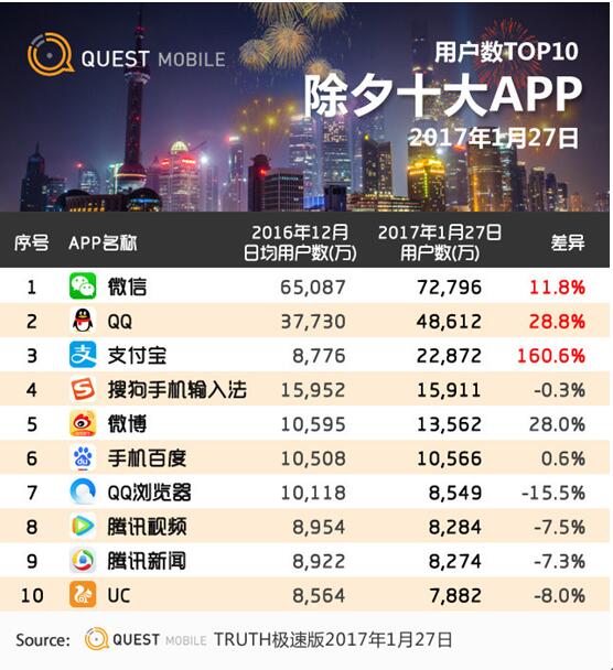 近日,大数据服务商QuestMobile更新了2017年1月综合资讯APP排名,受到春节假期影响,综合资讯类APP数据整体均有下降。日活数据方面,腾讯新闻仍以8627万日活位居第一,今日头条和网易新闻分列第二、三位,行业排名保持不变。
