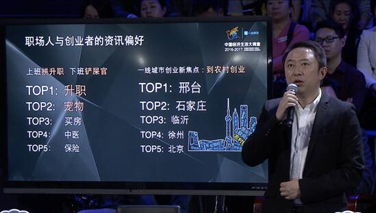 3月7日晚间,《中国经济生活大调查(2016-2017)数据发布之夜》在中央电视台财经频道黄金时间重磅播出。一点资讯作为战略合作资讯平台,连续两年与百度、腾讯、阿里、京东、滴滴、携程等十余家国内一线互联网公司,共同为全球最大规模融媒体民生调查活动提供线上配合与数据支持,从阅读偏好、百姓收入信心、创业意愿、关注偏好、消费偏好等10多个维度,发挥技术和数据优势洞悉国民经济生活。 一点资讯CEO李亚现场表示,2016年一点资讯用户在平台上共计产生了47亿次关键词频道的订阅行为,这些关键词频道涵盖了我们的工作、生活、健康、教育、精神追求等各方面,让即使再小的声音,也能在一点资讯平台上被听到。 职场创业阅读报告:“上班拼升职、下班铲屎官”成职场人生活常态 节目现场,一点资讯公布了关于“打工和创业的阅读兴趣点”的调查数据报告。通过对比“职场”和“创业”的关注人群,深度透析了这两大人群交叉式的工作与生活。数据显示,订阅“职场”相关类频道的网民数量是订阅“创业”相关类频道网民数量的2.7倍。