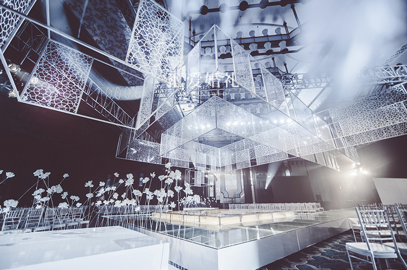 主舞台设计上,以上下呼应的简约几何体块为主结构进行对称设计,取天地相对之意,强调视觉的统一与和谐。 T台的设计上,打破传统的T型、S型、U型通道设计,采用包裹性T台和中心表演台相结合的手法。将原来的舞台视觉从一侧调整为中心,凸显空间感与视觉流畅性。 水晶玻璃T台下,数千朵玲珑细致,洁白无瑕的满天星,松松散散聚在一起,细小轻盈,宛若无际夜空中的点点繁星,似雾般朦胧,极具婉约、雅素之美。亦如花语本身所具有的气质,既不夺人风采,又能适时表现出自己的清雅可爱,含蓄恰到好处。 素 无镂空,不性感。追寻摩洛哥时代的花纹印记,我们用简单的几何线条,勾勒描绘现代的前卫与留空,至简至致。 取自摩洛哥建筑风格中的镂空花纹墙面,将其纹理简洁化,与直线几何结构相辅相成,以轻盈通透的花纹元素和简洁统一的线性元素贯穿全场,营造出柔美的几何空间。 桌花-延续整个宴会空间简洁花纹与直线几何结构相辅相成的设计理念,选用朱顶白、白掌、菟葵、高山羊齿、落新妇、蝴蝶兰、小菊等细小轻盈型花材,打破传统单一的桌花布局,宴会桌面装饰不再局限于桌花本身,而是尽可能与周遭的元素产生关联,从而联合组成更“开阔”的餐桌视觉。 椅背-利用雾面纸手工制成层叠效果,营造出雾面感,整体造型与整个桌花结构材质吻合,传递出通透轻盈的质感。 太极动而生阳,动极而静,静而生阴。静极复动。一动一静,互为其根...... 一场完美的宴会空间,由内而外,除却视觉的静观,还应留有可以令人身临其境多方位欣赏的动感。行至水穷,坐看云起,流动的线条,刚柔并济,满足现代化都市所有绅士淑女们对于“穿着”的完美幻想。此次春尚发布,特意邀来WECOUTURE高级定制、RUI'Z BESPOKE、Ruby Fang三大服装定制品牌,为所有绅士淑女们献出一场全新的定制体验。 还记得早前詹妮弗·洛佩兹在《美国偶像》上,一袭白裙献唱《Feel the light》,现场利用3D投影技术,将五彩灯光打照在为她专门定制的巨型白裙上,如梦似幻,堪称美偶史上最美表演。 在此次春尚发布现场,伴随着同样的音乐,在3D全息投影技术下,Claire Man珠宝 以爱妻之名,璀璨绽放。更有广州富力丽思卡尔顿酒店新任行政总厨莱博尔(Thomas Laberer)带领饼房厨师团队,发挥无穷创意,为所有来宾们献上的精美甜点。 为时尚立名,为潮流定义,汇集华南最强婚礼品牌阵容,聚焦婚礼流行最新趋势,一场全新的视觉与味觉盛宴,尽在汇爱婚礼2017高级定制春尚发布。 |