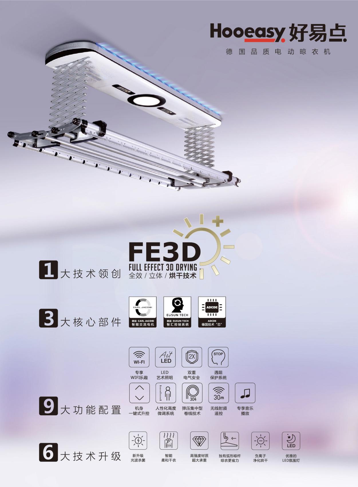 针对这些阳台的晾衣问题,作为“电动晾衣机标准制定组长单位”的好易点,将智能科技与德国技术相结合,推出了电动智能晾衣机系列,意在为现代都市阳台创造全新的生活体验。 好易点智能晾衣机汇聚了德国的“一大技术领创”以及德国芯的“三大核心部件”,“九大功能配置”:专享WIFI乐趣、LED艺术照明、双重电气安全、遇阻保护系统、机身一键式升控、人性化高度微调系统、弹压集中型卷线技术、无线射频遥控、专享音乐播放。从晾晒习惯的研究到对使用者感受的关注,全方位创造智能便捷的晾晒体验。
