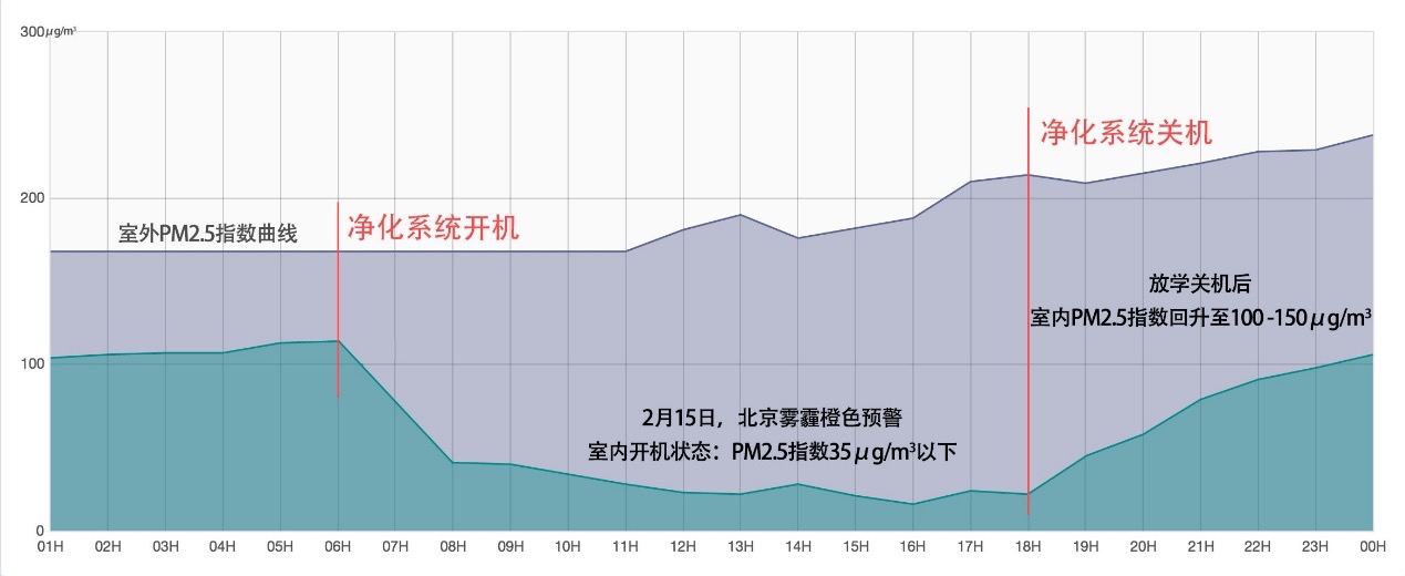 2017年2月14日至16日,包括北京地区在内,华北中南部、黄淮西部、陕西关中等地出现比较明显的雾霾天气过程,当日北京室外PM2.5浓度达300 μg/m3。但是,人大附小教室内的空气质量为显示为优,具体数据如图所示,智能空气净化系统开机状态下PM2.5指数为35 μg/m3 ,放学关机后回升至100μg/m3 左右,效果显而易见。