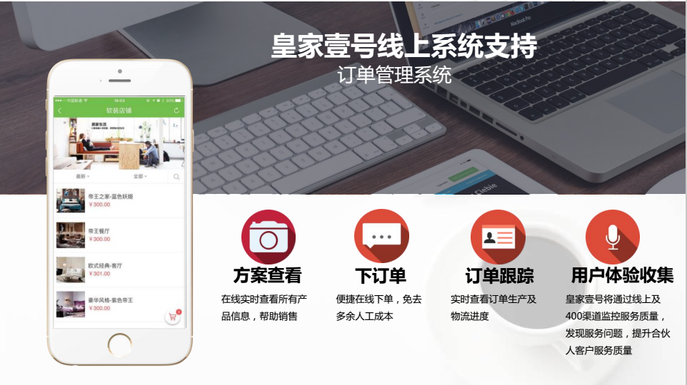 精准的订单确定体系,完善的出货管理系统,高效的干线运输流程,标准的同城配送体系,完美实现工厂直达客户家里,革新了传统家居销售模式。贵族式的售后服务体验,随时跟踪客户使用情况,确保客户的反馈意见第一时间得到解决,出现售后问题由皇家壹号售后统一解决。全国服务热线+PC端+移动端实时在线为客户解决问题,搭配本地化完美售后服务,及时上门为客户提供服务。保障高效率、高品质,让顾客更满意,合作伙伴更省心。 皇家壹号目前在全国拥有B端客户共计128家,覆盖全国17个省级行政区域,其中传统家装公司122家,包括业之峰装饰、居然之家乐屋装饰、元洲装饰、百安居、佳园装饰、星艺装饰、金隅装饰等等。互联网家装公司6家,包括一千零一艺ART1001(BIM+装配式全屋定制)、打扮家(VR技术)、装象网(主材电商平台)、白装网、亿装网、一起装修网。
