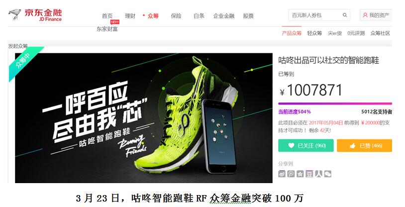 到底是什么原因能让一双跑鞋如此疯狂? 3月23日,咕咚智能跑鞋RF在京东众筹金额突破100万元,完成众筹目标金额的500%,超过5000名支持者。而此时,该项目距离3月21日开启众筹仅三天不到。 从京东众筹页面上可以看到,咕咚智能跑鞋RF在京东众筹开启多个价格选项,其中“支持199元可获得咕咚智能跑鞋RF一双”的500个名额遭遇买家疯狂认购,京东先后多次为该价格段“补档”。 而今天,在微博上关于咕咚智能跑鞋RF的话题“跺跺脚约个跑”也在午间冲上话题榜第一,一度成为用户热议的焦点。