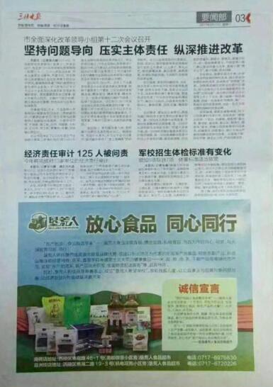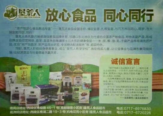诚信是企业发展的基石,垦荒人食品连锁,愿扛起健康产品的大旗,做健康生活的先驱者。 这是一种全新的方便、快捷的购物渠道,将来自全国各地五湖四海的特色产品直接由终端厂商运输到店面,保证了食品的种类多样性和价格的合理性,“垦荒人”就是这种新型模式的践行者。现代人追求健康的饮食生活,自古民以食为天,而食物原材料的把关和筛选成为了“健康之路”的重中之重。在食品市场发展混乱的今天,如何在当下琳琅满目的食品市场中选择一款经济实惠又安全健康的食品成为了消费者心头的难题,而“垦荒人食品连锁”秉承原产地优品甄选的原则,店内主营产品:米、面、粮油、干副食品及休闲食品等,店内产品源自全国乃至全球原产地,优质、安全、放心。其中,大米类产品多种,包括稻花香、长粒香、秋田小町、珍珠米等。门店提供保姆式的送货上门服务,让众多市民在家门口就可以买到来自祖国各地的米面粮油类放心食品,全力打造食品连锁服务的优质品牌。严格的终端把关和零售责任制度使“垦荒人食品连锁店”拥有良好的形象和稳定的消费群体。 3·15国际消费者权益日 宜昌垦荒人登上《三峡晚报》对广大消费者进行诚信宣言!