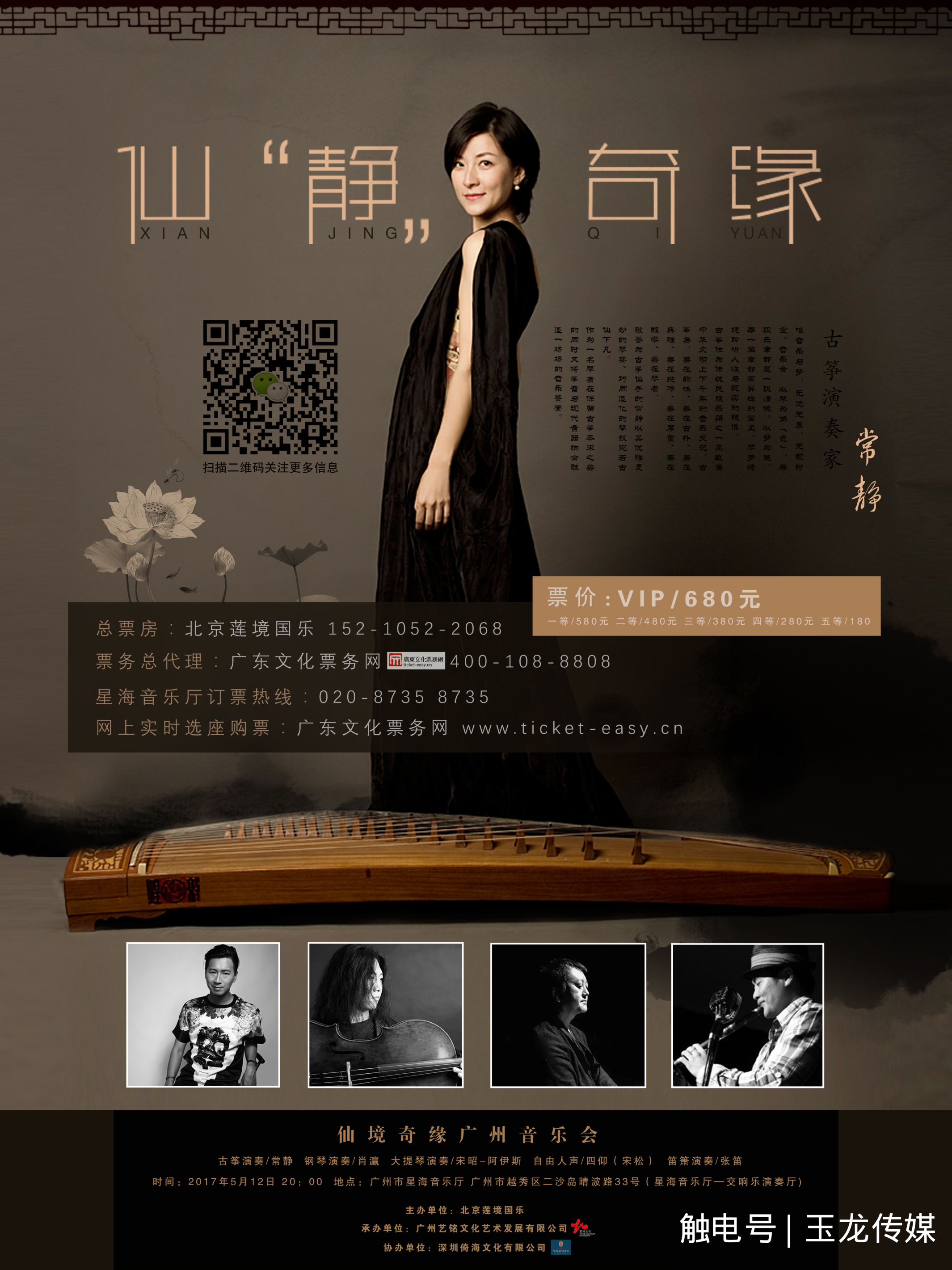 玉龙传媒讯3月24日上午10点,2017《仙静奇缘》常静古筝首演广州站在广东文化票务网正式开票,公开发售,市民及音乐爱好者可直接选座购票,VIP票价680元,最低180元。主办方放出好消息称,于4月10前购买早鸟票除五等票价外均享9.5折优惠,另外凡购买VIP票均获赠价值120元的5月13日常静老师音乐分享会。