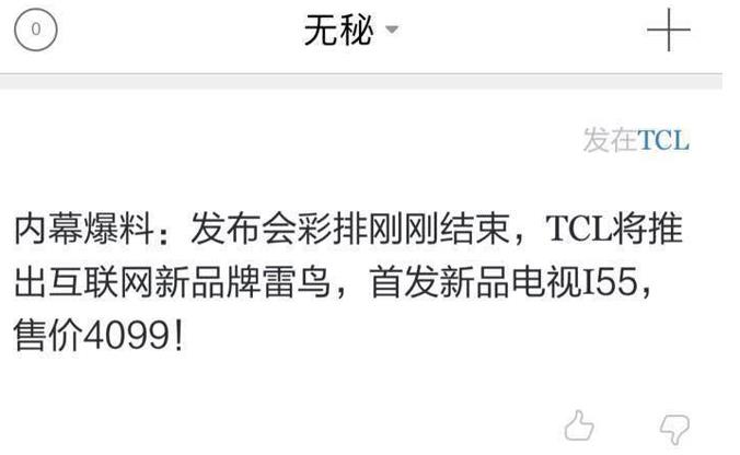 随着3月29日的临近,备受关注的全新互联网品牌雷鸟将于国家会议中心发布。就在发布会前一天,无秘中却流传出一条疑似雷鸟电视发布会现场的信息曝光,从曝光的内容我们可以看出雷鸟品牌明天发布的首款I系列电视产品I55的售价为4099元。