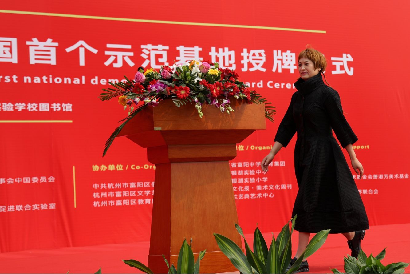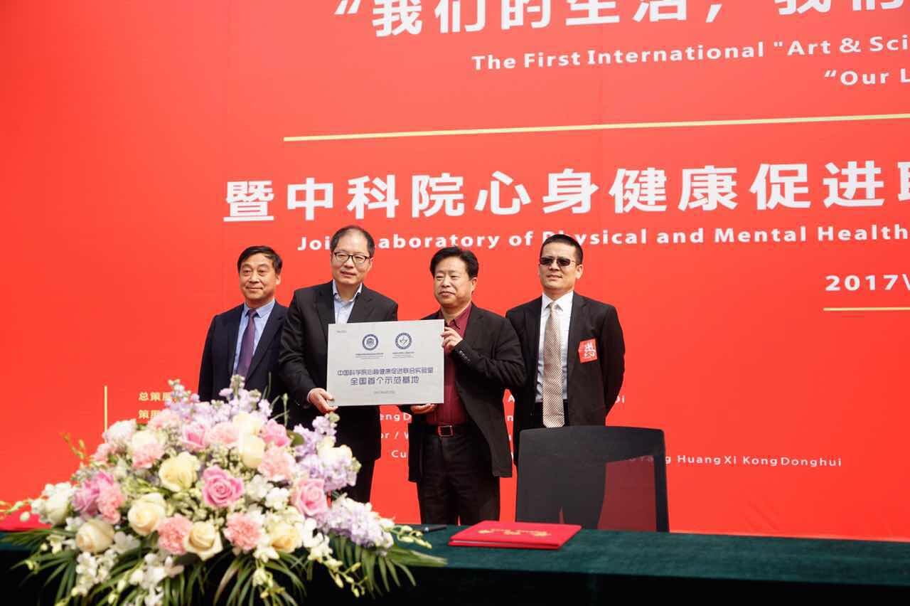 图为:嘉宾在授牌仪式上合影。从左到右依次为:富阳中学教育集团董事长徐松泉、中国科学院心身健康促进联合实验室副主任张雨青、集团总校校长朱生龙、中国科学院心身健康促进联合实验室主任周树民 展览及活动由联合国教科文组织国际民间艺术节组织理事会中国委员会、中国博物馆协会美术馆专业委员会、中国科学院心理研究所——中国科学院深圳先进技术研究院心身健康促进联合实验室等主办。由中共杭州市富阳区委宣传部、杭州市富阳区文学艺术界联合会、杭州市富阳区教育局等协办。由浙江省富阳中学教育集团、杭州银湖实验中学、杭州银湖实验小学、中国文化报·美术文化周刊、新西兰艺典艺术中心等承办。