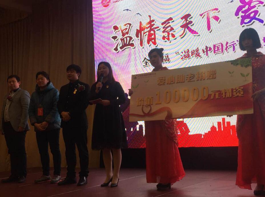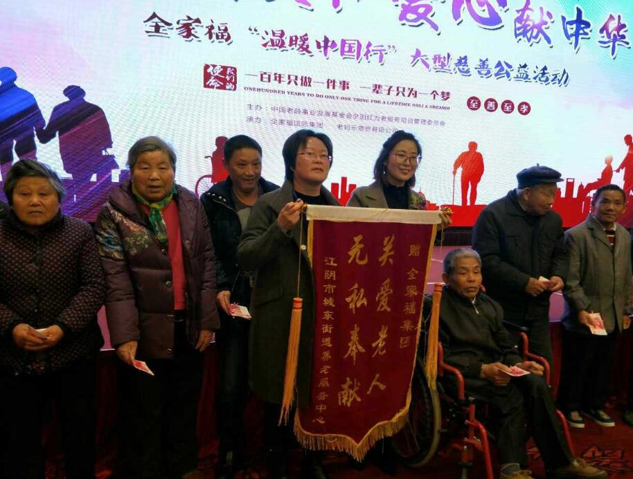 3月下旬,由中国老龄事业发展基金会夕阳红为老服务项目管理委员会主办,全家福国际集团、老妈乐商贸有限公司承办的温情系天下,爱心献中华一一全家福“温暖中国行”大型慈善公益活动在江苏省拉开帷幕,为常州、无锡、镇江、泰州、扬州、江阴、南通、徐州、湖州、盐城十大城市的数十家养老机构进行了捐赠。