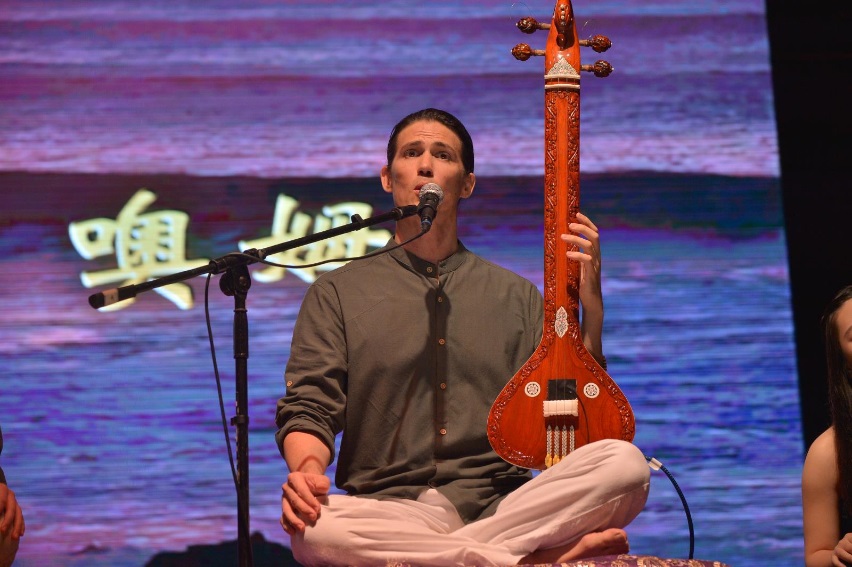 晚间的演出由金阳的出场而拉开序幕,聚光灯下,金阳置身于宁静的海洋背景之中,琴声悠扬地弹奏着坦布拉琴(古印度乐器)。 在一段启迪人心的梵文诵读后,金阳唱起了旋律优美、深入灵魂的瑜伽语音。深沉而又安抚人心的吟唱在整个大厅里回响。观众也随之清唱回应,伴随着背景屏幕里夕阳余晖撒落在平静浪潮中的壮丽景观,超然的瑜伽语音缭绕于整个大厅之中,久久地共鸣回响。