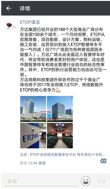 昨天上午,ETCP CEO谭龙在其个人朋友圈发布消息,称“万达集团已经开业的188个大型商业广场部分在全国150余座城市,一个月时间整,ETCP从前期准备、项目勘察、设计方案、物料运输、施工安装、运营培训到接入ETCP智慧停车平台一气呵成。万达广场从此全面迈入智慧停车时代。2017年内,万达网络科技集团外部合作的过千个商业广场也将全部接入ETCP。”这是这位国内智慧停车行业的大佬继投入5亿发展上海市场和全面对外公布停车场数据之后的又一则重磅消息。