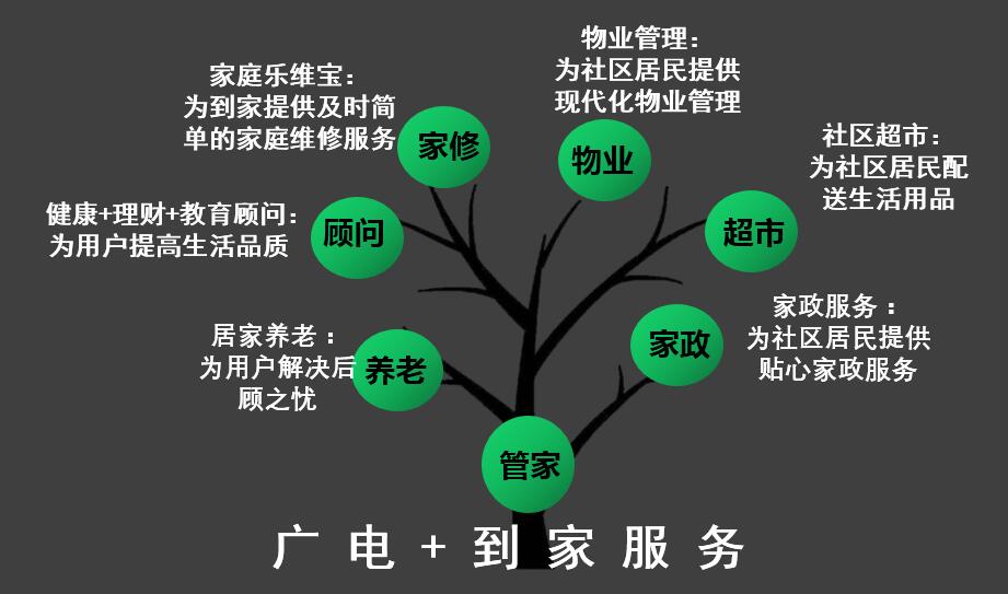 “广电+到家服务”源于用户思维,它提倡广电运营商在实施网格化管理、营维一体化的基础上,通过信息化的支撑、实现服务便民化、经营多元化。“广电+到家服务”强调企业通过网格技术、创新网格化营销;强调企业通过文化驱动的网格承包经营,提升用户黏着力,在打造企业最后1米的核心优势基础上,不断给用户提供丰富的选择、完善用户体验,从而给企业带来持续的产能提升!