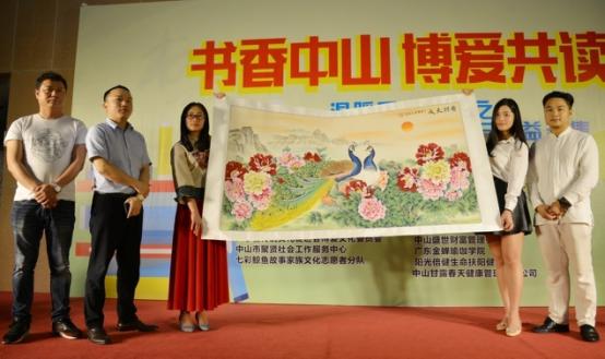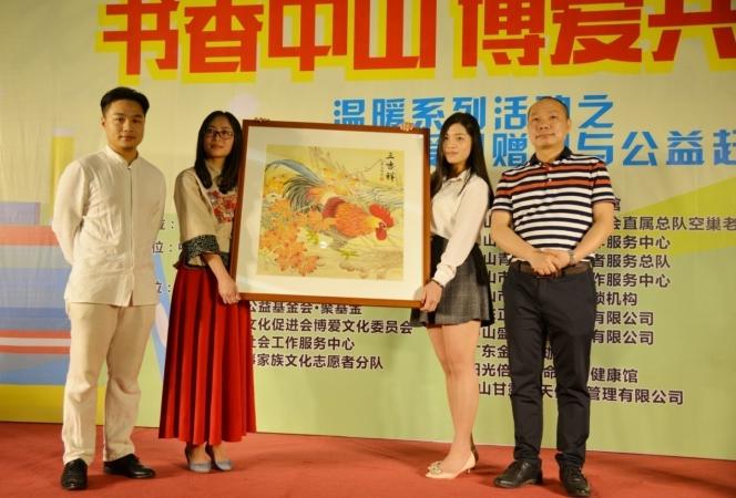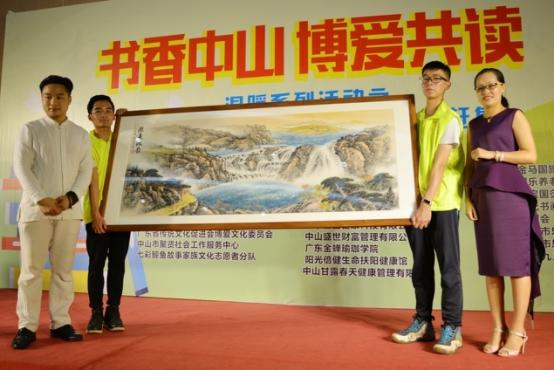 图说:爱心企业家、恩德五金董事长余传伟(左2)高价拍得吴文锋禅意国画《秀羽天成》。 图说:爱心企业家、中山金马国旅总经理邱薛晓女士拍得《源远流长》。 据了解,书画家吴文锋是2015年度全国首届孝道公益宣传使者,采访时他对记者说:今晚数十位爱心人士抢拍作品,令他很感动。“积善之家,必有余庆”,他坚信好人必有好报。中山是一座有文化历史的博爱宜居之城,作为中山人,深受孙中山精神的影响,他将继续专注艺术创作,支持公益。