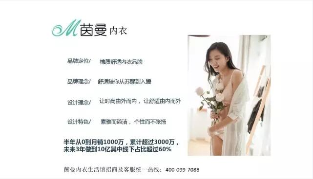 关于“茵儿内衣生活馆”的发展目标: 2017 门店数量(直营+联营)达到50-100家 2018 门店数量(直营+联营)达到500家 2019 门店数量(直营+联营)达到1000家 茵曼内衣生活馆招商及客服统一热线:400-099-7088,我们期待您的加入。 以下是演讲PPT干货实录: (温馨提示:可点击放大查看PPT图片内容)