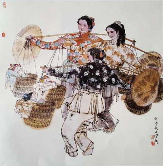 《江南风情》 96×96cm 2005年 他的作品素材采撷于真实的自然,而他的笔触透过了自然,伸向了人物的内心,注重对人物的内心进行开掘,进行诗性的放大。他着力于用情景交融的手法,折射出人物曲折幽深的精神世界,表现出人在不同的环境下的不同状态,从而使现实生活得到最大程度的诗意化,哲理化的延伸。其画外之致、象外之意很是惹人玩味,时而给人一种浮生若梦的幻觉,时而给人一种时光倒置的错觉,只觉得某种气息如影随形,且歌且吟,吸引你去探寻、挖掘。这是马西光作品里非常动人的一点。他的画很有味道,很有色彩,很有气度,很有分量,文学的通感在他的笔下变得那么可触可感,他让粗狂豪迈的高原,传达出梦一般的神秘、雾一般的迷蒙、月一般的柔美。在《水乡月夜》里,挑担的女子与身边行走的耗牛,悠悠的踩在独木桥上,完全融化在夜的蔚蓝色光芒之中。《草原之舞》,那墨团、笔痕的微妙变化,稚拙的人物造型,风中舞动的丝带,犹如一支曼妙的草原舞曲令人遐想;《草原铁流》,浓重的墨块、富有节奏感的线条,又让人顿生信马由缰、策马奔腾的快意。《湖水粼粼》,墨色交织的波光中,白衣女子优美的一个舞蹈姿势,在圣洁的雪域高原上,空灵而无声地绽放出一种迷人的繁盛景象,体现出一种充溢于自然与心灵,时间与空间之间的生命大美。马西光先生在吸取传统精髓的基础上,感悟天地之造化,极尽技法表现之能事,启示着艺术之道,他敏感而直率的视角似乎能看透事物所蕴藏的全部意义,从而提炼出事物之魂,撼动人心。