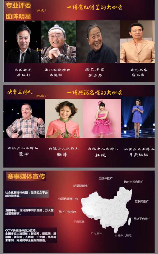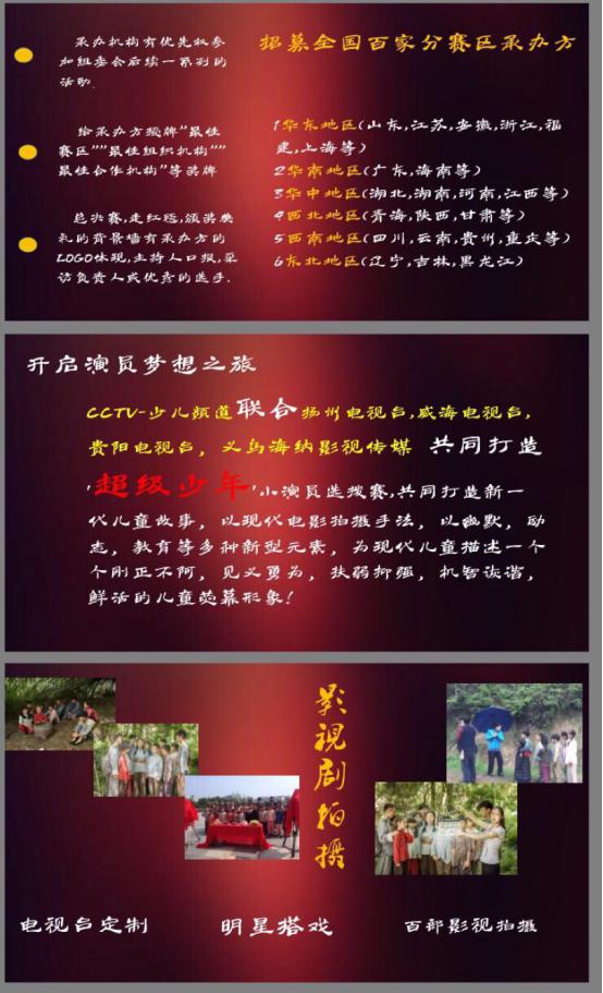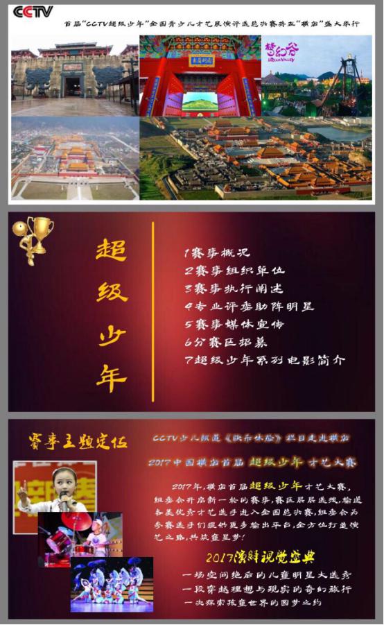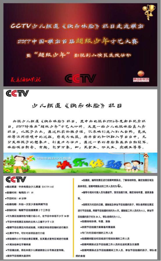 热烈祝贺,由浙江义乌海纳影视文化传媒有限公司举办的首届大型CCTV全国青少年才艺大赛,据该公司制片人王天云介绍:暑假期间将在横店开启并召开新闻发布会,届时会有央视知名主持人和明星大腕参加。参加选手将有机会:上央视春晚、星光大道、非常6+1、黄金100秒、等各大综艺与各影视剧组拍摄。 欢迎全国各地政府有关部门、企业、文化影视公司、儿童经纪公司、艺术机构等加盟、如有冠名商、赞助商、协办商等前来组委会咨询。