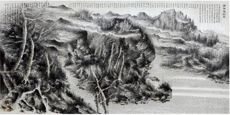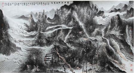 (云伴清溪听梵音 124CM x248CM 2015年 于军福作) 军福先生作品中的空间性多重性构造具有中国画的本体价值与意义。如前述作品中的黑白灰关系,在二维平面空间中,它们呈现为一种秩序性的排列——黑色的山脉,灰色的溪流、河岸,白色的烟云雨雾……在这一符号关系中,黑白灰色含着虚实关系、形意关系,即现实与虚拟关系,画家笔下山水意象的传统经验与虚拟的关系完全倒转,摒弃了时间因素,画面则呈现了全新而陌生的视觉感受。 因为,传统绘画在时间处理上,并不绝然排斥时间因素,传统三远法的“平远、高远、深远”中仍有时间因素的作用;而军福先生的山水画则体现出单纯的空间特点,他画面中的山水符号排列明显地表现为空间对时间的覆盖,不仅不在画面中交待时间的顺序和先后,且有意模糊了画面中的时间关系,通过这个方式消解了画面中的因果关系依赖而转向偶然和神秘,因此,有限画面空间中的符号、意象及其黑白灰关系脱离了客观性与逻辑关系,呈现为自由、跳动、轻松、随意的特点,营造了多空间的相加,错位等几何形体的关系,使作品体现出本质性的气息。