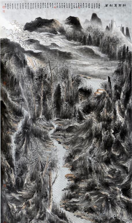 (云峰秀泽图 68CM x136CM 2017年 于军福作) 这种本真的纯正性,首先存在于画家的心中,才有了艺术本质的纯正性;由此,便不难理解画家作品的特点与意义了。 “以我之笔,写我心象”,是军福先生的绘画状态,也是对庸常与因袭脱离的必然状态;如《寒林幽谷》、《林泉高致图》等,其外在结构是空间错位与互渗互动的,内在结构则是以画家精神为主线,随情绪变化而呈现的节奏与韵律。其中,一个明显地事实是,符号、笔墨、空间,都隐含着一种抒情动机,并体现出从古典到现代的演绎轨迹;而且,我们也分明看到,画家对待创作的认真艺术态度,以及用笔用墨的处心积虑和呕心呖血、精益求精,几乎都在水到渠成的沉淀中完成了艺术的运转与提升,并且从容自然,境界开阔。