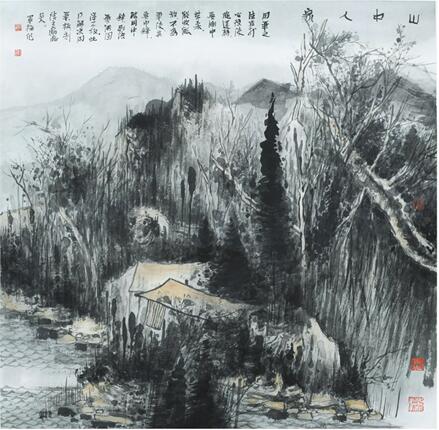 (山中人家68cm×68cm,2016年,于军福作) 严格的说,作为山水画家的军福,乃是一个空间的意写与表现者,他坚持用自己的眼睛观察世界,用自己的笔墨表现对象,而笔下山水符号在此起着结构性作用,使具有梦幻色彩的玄想世界及其符号借此成为现实自然情态的隐喻与象征;为此,军福以数十年笔耕、勤勉历炼,终于收获了可喜的成果。