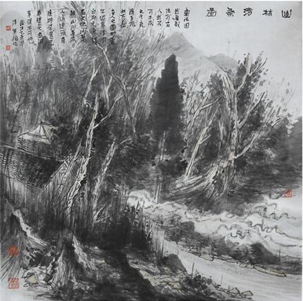 (幽林清气图68cm×68cm,2016年,于军福作) 他的作品《山中人家》、《山中隐居》、《幽林清气图》、《寒林幽谷》、《林泉高致图》、《深谷幽居图》、《云林层隐听溪声》等,在这方面都有极为突出的表现。显然,军福先生笔下的山川、流水、云烟、屋宇都可归于感性生动的生命形式,在远离世俗、拒绝平庸而与山野、溪流、云水与村落的虚拟、梦幻的方式相融,并进而脱离现实经验世界,与情绪化的山水符号、臆想的心象结合,在情感的注入和情绪化的表现中,凝定为富于想像性的山水世界;它同时又是经验世界和虚拟世界互为联系的桥梁,通过情感与情绪在画面中的演绎,使山水意象得到夸张、变形、错位与交迭,使之与现实世界形态拉开距离,并渐显为形而上的特点与虚拟性的“精神家园”图景。 由此,军福先生的山水画开启了梦幻图景与虚拟世界的“神秘之门”。