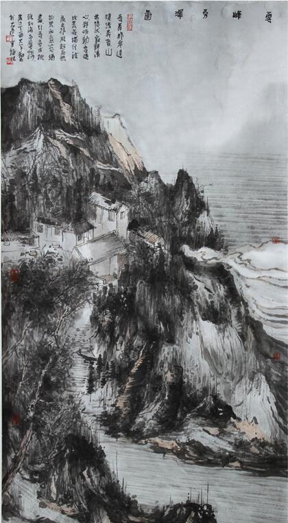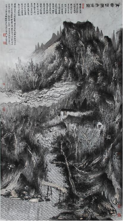 (祥云深处有高隐 90x180CM 2016年于军福作) 军福先生自觉置身于当代文化语境,领略八面来风的时代气息,使他把吮吸营养与感受新的历史氛围相结合,成为新创造的动力,这一切成为他人生的自觉和艺术的自觉。在孜孜以求中,画家扩大了视角,转化为思维方式,得以在多维视野的理解中自由穿行。使画家笔下的山水意象、符号呈现鲜明的心象特点,在神秘的心象状态中,以朴朔迷离的方式表现为由远及近、又由近到远的动态性和无所羁绊的精神自由特点。