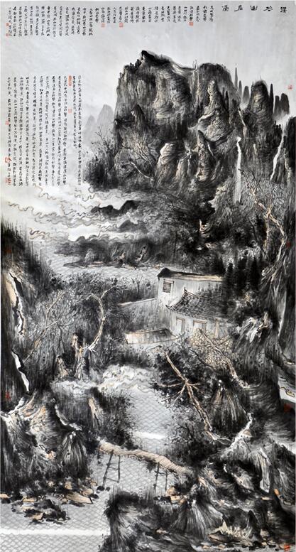 (深谷幽居图124cm×248cm,2016年,于军福作) 经历过种种历炼,军福先生的山水艺术成为了一道独特的风景。 在这道风景的背后折射出画家于军福先生出色的写意能力。他的山水画在笔墨技法上的独特性在咫尺空间中也得到充分显现,他同时也在艺术本质的前提下和艺术自觉的高度上进一步显现出“以技入境”的轨迹与遵循。从这个角度看,军福先生的艺术风格与表现技巧,是因为其独特的思维方式在自然而然的外化中一种艺术文本的实现罢了。 传统山水画中的时间性,是因果性、必然性的关系显现,军福抽掉了山水画常态思维的时间因素而代之为空间性,画面中的“小中见大”、“平中见奇”,便在密集的线条、苔点与块面中,经过虚拟与真实、人物与背景、感情与情绪等的起伏、跌宕与波动中给以表现,成为空间性的隐喻,成为神秘氛围中偶然的间断性的接合。
