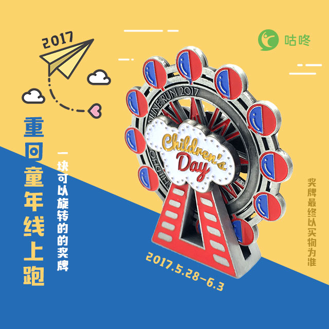 人生就像摩天轮,每一个节点都有不一样的风景。咕咚重回童年线上跑的限量奖牌,代表着“可以旋转的幸福”,值得与童年一起珍藏。游乐园的摩天轮,承载了许多人的儿时记忆,小时候,能坐上一次摩天轮,晚上都会笑着睡着。每个人在长大之后,都会去重温,坐上它的人,无不怀着纯真的快乐心情。让我们重拾童年的简单,传递孩子般天真的快乐,生命不息,我们就可以跑步不止。 现在打开咕咚APP,点击“发现-赛事-线上赛事-2017重回童年线上跑”,报名参与线上赛;在六一当天,点击“运动圈-附近-跑场”,看看在附近的跑场,有多少重回童年的跑友,在憧憬初心?只要有人陪伴,只要有人超越,就会有更大的动力。 咕咚线上马拉松,让每一名到不了马拉松比赛现场的跑友同样享受参赛的诚意、完赛的乐趣,重回童年,意味着你和我,即将拾起记忆的贝壳,来一次意气风发的约定,开始一场激烈的竞赛——跑不回六岁,算我输! |
