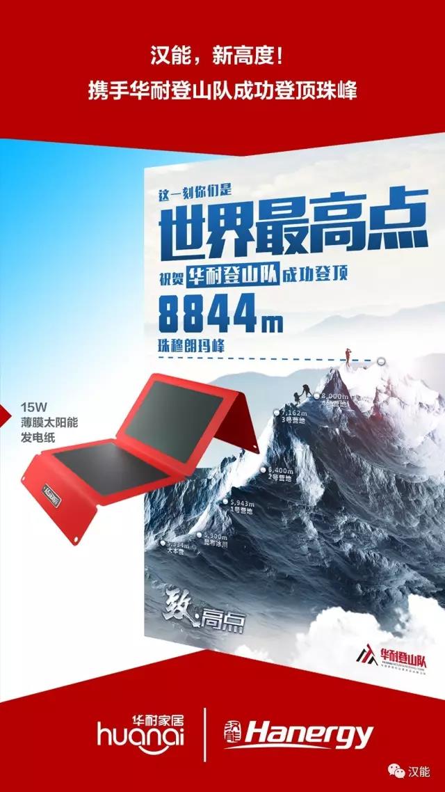 ▲登山队队长马建国在珠峰山坡使用汉能发电纸 华耐登山队概要 华耐登山队于2013年由华耐家居组建,立志完成“征无止境7+2”攀登版图,徒步到达七大洲峰和南北两极点。登山队队员均来自华耐家居员工,此前,他们已经经历了五站,非洲最高峰——乞力马扎罗;欧洲之巅—厄尔布鲁;南美之巅——阿空加瓜峰;北美之巅——麦金利峰,第五站是北极点,珠峰是第六站。 珠峰是喜马拉雅山脉的主峰,其山体呈巨型金字塔状,威武雄壮昂首天外,是中国最美的、令人震撼的十大名山之一。沿途冰川上有千姿百态、瑰丽罕见的冰塔林,又有高达数十米的冰陡崖和步步陷阱的明暗冰裂隙。这座全世界山峰的女神英姿一直吸引着无数攀登者前赴后继。因为,这是一个我们处在城市、村镇中完全无法体会的世界,一个只有0.00007%的人类经历过的世界。5月22日凌晨,华耐登山队不负中国企业所望,不负同行人之众望,成功踏上海拔8844米的世界之巅,将中国企业“永不放弃”的精神带到了全世界的顶点。激励着所有企业不断实现自我、突破自我、攀登向上的发展,也诠释着永不放弃的中国精神!