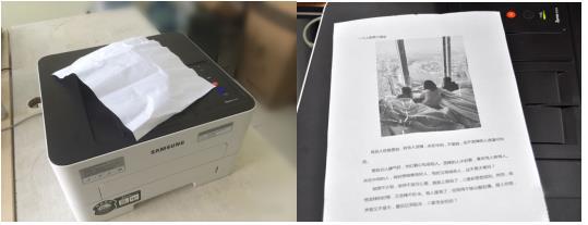 让我们来测试一下,将一张纸弄褶,然后将它放到三星M2626系列打印机中进行打印,结果打印出来的纸不但没有卡纸,而且打印效果丝毫不会受到褶纸的影响,打印内容十分清晰,跟新的没有两样。