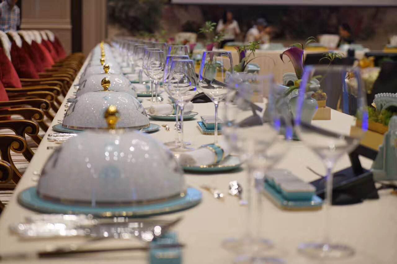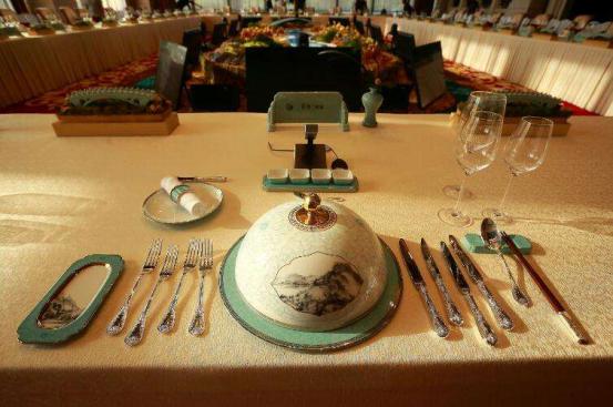 “丝路国宴”餐瓷一览 此次论坛上,还原当日“一带一路”峰会午宴的布置,参会者们得以饱览这套“丝路国宴”的芳华之姿。“雅致”、“大气”、“清新隽永”成了参观者们对“丝路国宴”的一致评价。据“丝路国宴”主创介绍,这套餐瓷共有60多个器型,器物之间尺寸严谨,整体色彩运用清新的蓝白相结合,淡雅脱俗,与雁栖湖的环境相得益彰。餐瓷的冷菜组合由圆形的展示盘和八角顶的冷菜盖组成,圆浸透着中华民族先民最朴素的哲学,圆则满,满则圆,心有圆满便安宁不争,便以和为贵,同时也代表着和谐、圆满。八角顶表达了喜迎八方客诚待四海宾的真诚之心。