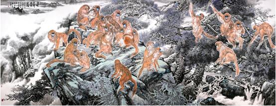 金猴岭上240x680cm ■ 贾德江/文 大约在十年前,年轻的郑瑰玺曾以工笔重彩花鸟画现代感的独特追求享誉京城,不仅在《全国高等美术院校教学范画集》中入选了他的作品,《美术》、《国画家》、《人民日报》、《江苏画刊》、《美术界》等多家报刊也先后发表了他的作品。尤其是在中国美术馆成功地举办了他的个人画展,更加引起了学术界的关注和世人的瞩目。迄今为止,他的那些彩墨交融、五色缤纷,充满瑰丽奇幻的画作仍然令我难以忘怀。他的独特性在于他选择的题材是新颖的,大多以他家乡神农架的自然景观为创作源泉,通过对山花野草、杂花生树、藤蔓缠绕、珍鸟奇禽、竹石碧波的描绘,去表达他对于原始森林中动植物野、奇、繁、艳的感受;他表现的手法是别致的,没有对古人和今人的因袭模仿,而是以特有的语言图式与具体景观相融相合,去再现一种全新的视觉效果,其中不惜借用西方后期印象主义代表人物亨利·卢梭富于幻想色彩的画面形象,在鸟语花香中去营造一种色彩斑谰、神秘幽深的光影迷离之境。他的作品,不论是《草木依然青葱》在野卉飘香中叙述的一个梦幻般的神话故事,还是在《月光下的鸟声》中上演的一幕森林夜色朦胧的童话剧;也不论是《野芳》、《浓阴》下的似真似幻的花鸟景象,还是《三思图》、《秋虫低吟》中对自然神秘世界的向往,都可以彰明较著地看到郑瑰玺在中国工笔花鸟画的界域做了极大的开拓。他用浑朴旖旎的彩墨画风,凝集成一种新的中西合璧的艺术形式,来表现一个现代人的心灵世界,创作出更为自由、更为广阔的视觉表现空间,对繁荣和发展中国工笔花鸟画具有极为重要的变革意义。