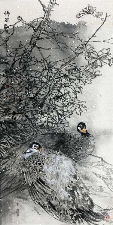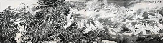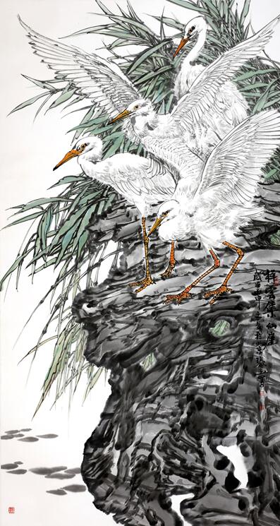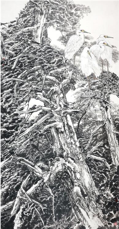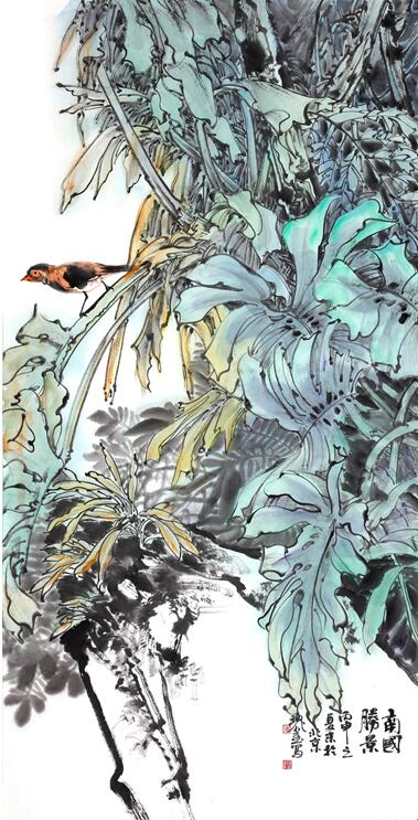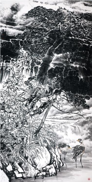 极目江天阔96x198cm 而他的写意花鸟和他的工笔重彩可谓一脉相承,不仅依然立足于表现湖北西部大巴山区神龙架的原始森林的自然景观,而且大胆地采用花鸟与山水结合起来的理念,将禽鸟融入原始生态的树石花草之中,以“大景花鸟”的图式,表现大野雄风强悍瑰伟的奇情,讴歌原始花树幽深丰茂生生不息的哲理。画中空间的广度与深度极为开阔,造出的意境主要不是诗意化的,而是更生活化的,表达更贴近自然的空间氛围,语言手段在于削弱色彩的表现力而拉大墨色浓淡与用笔的虚实程度,不是“逸笔草草”的把玩式写意心态,而是“意而有工”的宏观意识的建构。