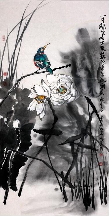 满塘荷气136x68cm 郑瑰玺的创作经验证明,正是对传统花鸟画形式语言的不断地变革创新,使他的工笔重彩花鸟画具有多层次多侧面的内在蕴含,体现为艺术与生活、艺术与人类交错作用而形成的丰富性。画家意在以自己的艺术去表达人们对自然的憧憬、理想与改变,由此形成了他特有的艺术个性,既是深厚传统与时代精神相结合的产物,也表现出鲜明的民族风格和现代气息。 近年来,郑瑰玺在现代彩墨工笔花鸟画探索的同时,又致力于写意花鸟画的创作和研究。其实,他的工笔重彩花鸟画不是传统严格意义上的工笔画,“写”的意味十分强烈,多从色彩、绘画性、装饰性及色墨结合的角度去思考,其突出表现形式是以笔墨为依托,强化色彩的表现力,把色彩提升到与中国画中的线条、笔墨、造型一样重要的地位,说它属于“工而有意”的“重彩写意”范畴更为妥贴。