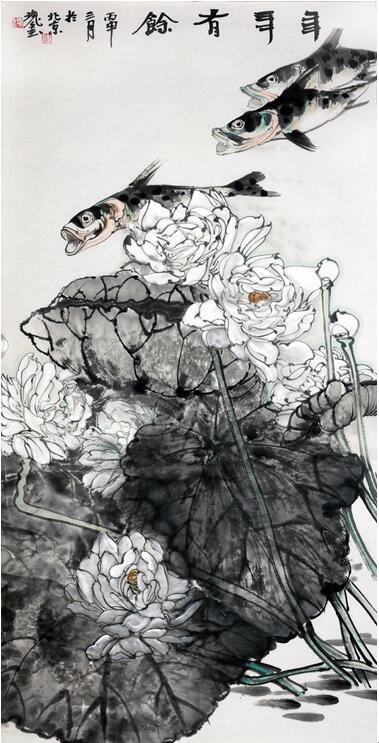 年年有余136x68cm 在郑瑰玺看来,中国画的传统是一个发展着的艺术体系,传统的概念必然随着现代中国画家观念的更新而拓宽他的内涵,向着既是“传统的”又是“现代的”方向发展。作为绘画观念的物化形式的传统笔墨,也将随着中国画向现代化发展而呈现出它的现代价值。囿于古人的笔墨不行,游离于传统更不行,必须在题材的开拓、笔墨的更新、立意的独到三个方面融进当代人新的感受、新的情绪、新的思想、新的精神,使花鸟作为艺术形象呈现在画家笔下时,一个个都成为有感情、有个性、有生命、有灵性的形象载体。