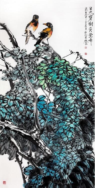 高枝一曲136x68cm 仔细阅读郑瑰玺的写意花鸟作品,印证的正是这一点。 郑瑰玺写意花鸟画的鲜明特性,从一开始就表现出直接取法于自然的笔墨语言,强调尊重审美环境的重要性,也是他的大景写意花鸟画具有浓郁地域色彩的依据。这种“大花鸟”意识既不是文人花鸟画一花半叶的小情小趣,也不是文化寓意、人格象征的符号化,而是以美的客观存在为基本观念,让那些原来被文化选择所遮蔽的千花万木进入他的视线。其中包蕴着大千世界的丰富性、生动性是独特的,因而“清新”、“自然”始终充盈着他的每幅画面,他也因而是很少受传统程式束缚的画家。正像他自己所说:“当我每次走进神龙架的原始森林,大自然的魅力时刻都感染着我。满山的花草树石,庞大密集、藤葛交错、花树繁茂、溪水长流,一切都那样恬静和肃穆。我欣赏那种莽莽丛林神秘瑰丽、生生不息的状态,我希望能通过绘画表达我对于原始森林那种实境的感受。”也正是这种实境的感受,不仅使他获取新颖、生动的创作素材,更重要的是改变了他的艺术构思的经验和语言手段,走向具有纯粹视觉审美价值的领地。