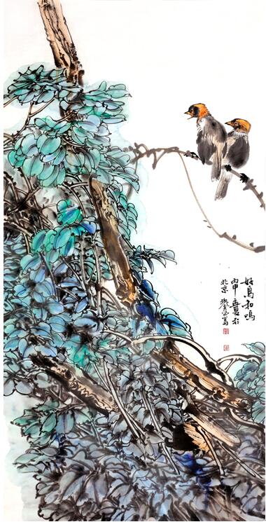 南国佳音136x68cm 他的画风属于小写意花鸟画范畴,在美学情趣和工致程度上介于大写意语体和工笔语体之间。从师从上看,他是用林良、吕纪的笔法,参以陈淳、徐渭、八大具有高逸情趣的水墨精神,将工、写两家合流而成就他独有的兼工带写风格,使自己的花鸟画舍弃赋色鲜活明丽的一面,而取其勾勒、点簇、没骨交替互用的一面,走上了一条崇尚“水墨为上”的回归传统的道路。