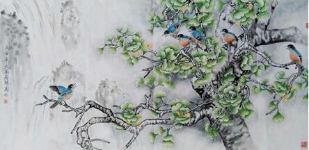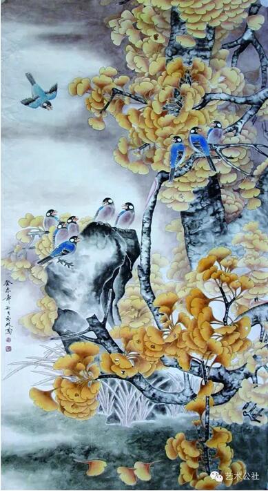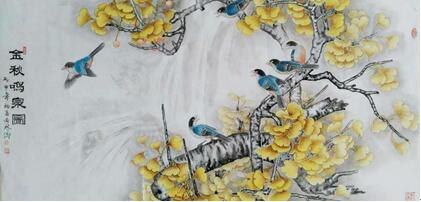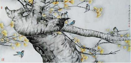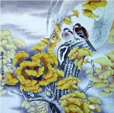 锁定题材并非难事,难在使主题得以深化、升华,从而塑造一种属于个人化符号的载体,传达出作者“情、趣、意”,这才是一个画家的艺术灵魂所在。为此他深入对中国古典文学的学习。在《诗经》中寻找银杏倩影,在魏晋散文里搜索银杏品格,到农村山区去聆听有关银杏传奇的神秘故事。那是一个个充满虔诚敬畏的老人真心诉说。大凡数百年的银杏树下都会披红挂彩,香火缭绕。似能保平安、祛病魔。他受到长期的银杏熏陶,对银杏充满了敬爱之情,使他不得不借笔墨以抒胸臆,以浇块垒。吴冠中先生曾经说过:“感情能永远流传,历史选择的第一是感情。”诚然,我们在开卷展读任何一件画作时,首先映入眼帘的是作品的气息,是作品蕴含的“情、趣、意”,如果没有这些,那这幅作品就是没有灵魂的行尸走肉,毫无意义。刘西林不是这样的作品,他的作品充满着一股盎然生气。画鸟,鸟儿啁啾;画花,花似解语;写莲塘,但觉凉翠满襟,柔碧无际;写银杏,一片灿烂,叶如黄华,秋色如醉。他的银杏系列,演绎了不同时空的银杏风情,每幅都可以诱人深思咀嚼,带给人们田园般的诗意陶醉。他的构图,又有另一番景象。既传统又现代,繁而透,空而灵,动静结合,素艳得宜。大多以斗方形式出现,很合适现代建筑装潢的风格。