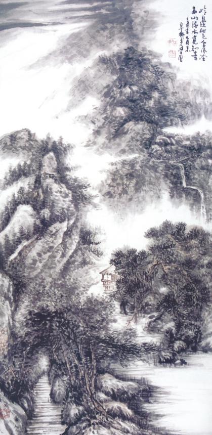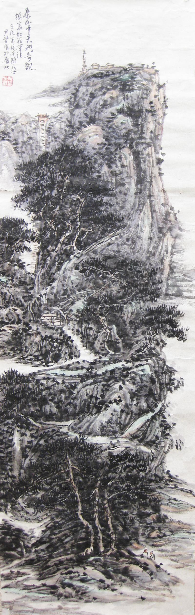 先生一步步的努力也使得自己创作和学习空间越来越大,被推荐进入文化部门工作后,专职的创作空间带来了他创作的第一春天,随着各大国展和省展的作品展出,他慢慢成为一名大家熟知的画家了。但他不满足这些,多年对传统绘画的研习和积累对作品有不断的有了自己的见解,同时定位山水画作为自己的主攻方向,虽然走遍三山五岳,但宋代禅宗大师青原行思提出参禅的三重境界:参禅之初,看山是山,看水是水;禅有悟时,看山不是山,看水不是水;禅中彻悟,看山仍然山,看水仍然是水。所以泰山就自然成了他踏遍三山五岳后的创作灵感之源,也成为了毕生为之呕心沥血的创作之本,而一年多次的泰山写生也让泰山的每一块石头,每一棵小树都熟悉了他的身影,他应该是一个“泰山歌者”,他的一生应该是为讴颂泰山而来,正如梁文博老师送他的一幅字“寄情山林”,看来他的确是要做一个泰山苦侣了。