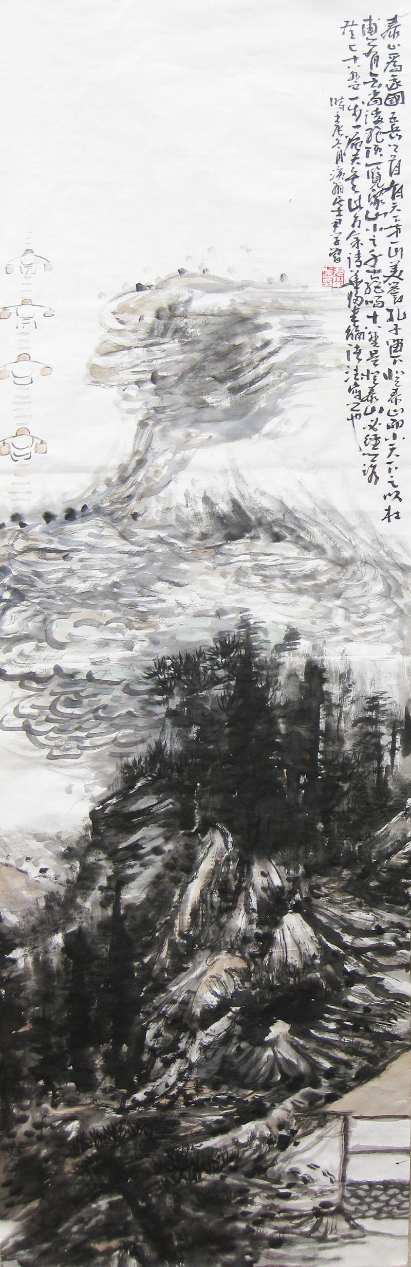 学古但不泥古是学曾先生的信条,不断摸索和感悟,在笔墨间游走和取舍也是其作品让人感受不一样的地方,一直以来,拜访名师良友学习切磋画艺一直是他的习惯,融合、打破、重建一直是他不断前进的方法,以致简至极简,以一化万,石涛说:“太古无法,太朴不散,太朴一散,而法立矣。法于何立?立于一画。一画者,众有之本,万象之根。”又言“盖自太朴一散而一画之法立矣。一画之法而万物著矣。”一画作为“众有之本,万象之根”,即是万物生成的根本。老子云:“天下之物生于有,有生于无。道生一,一生二,二生三,三生万物。”而老子所说的“一”,与石涛的“一画”亦可等同视之。学曾先生亦对“一画之法”颇有感悟,所以“一画之法,乃自我立”,这个“一画之法” 之所以被他推崇,是因为绘画跟“心”的密切关系,画受墨,墨受笔,笔受腕,腕受心,人通过心感受自然万物,心发出情与思,通过笔墨传达于画中,以表现自然,这就出现了人(心)—天地(宇宙万物)—绘画(笔墨氤氲)的三维关系,而连接这三者关系的,非“一画”莫属。由此想来,学曾先生以泰山为主题展开一生的探究和描绘意义也很明了了,同时他对泰山的热爱,对山水的情感也只能用手下纸笔来纵情抒发了。
