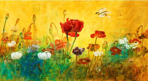 《万紫千红》 尺寸:192x96cm 梅琦,又名若宜,都说人如其名,她便是这样一个如名字般优雅的女子。都说画如其人,她的创作面貌丰富,给人以浓妆淡抹总相宜的印象。梅琦的绘画风格是多变的,她可以画的工整,传统到骨子里去;她又可以很现代,将西方装饰艺术的观念引入作品,甚至营造出超现实的氛围。