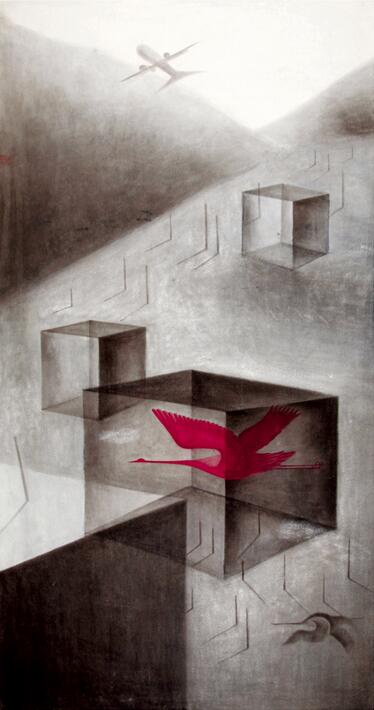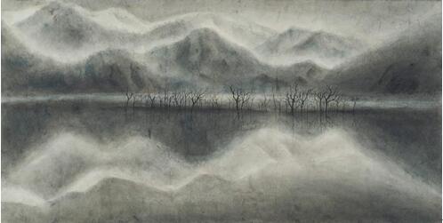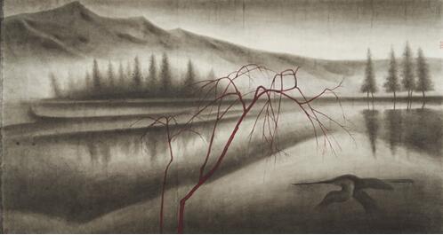 《虚影之六》 尺寸136x68cm 与花花草草相比,梅琦的水墨创作更多体现出她对于生命大爱的思考。虚影系列让人第一眼就陷入一种梦境。她不再摄取某一物、某一景、某一形、某一象,而是综合了主观与客观的“意象”。在这里,一位温婉的女子带领我们时而悠闲,时而阔步。在这一系列中,梅琦努力在营造一种孤寂与空灵,这里体现的是她对大自然与生命的关注,色调是灰暗的,阴冷的,时而一只孤鸟翔于云端留影于水面,时而一棵老树在薄雾中暗自神伤……梅琦想为我们勾画出一个失落的场景,这个梦或许不是美好的,但它是值得我们去思考与反省的。在梦境里,赤裸裸的表象与喧嚣的现实之间永远相隔,保持一定的距离,伴随细腻的感触让我在梦中认知,这便是世间的轮回与解脱。在这样的梦里,我试图以静谧的姿态走近梅琦的世界深处,跟随她的笔触一起呼吸,感受清冷与落寞,在我看来,这样的画作是神奇的,它能让我读出画者的心事。画面中,朦胧中携带着寂静温婉的笔触,是氤氲的画面中所释放出的优雅气息,这些都足以让我在每一幅作品中找到不同的梦。