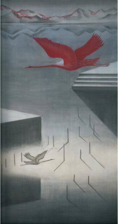《超渡1》 尺寸:136x68cm 梅琦的画,让我在梦境中行走,女性的特殊情感和诗意的情愫落于画面之上,沉浸其中的我,将思绪专注于时间与空间流逝中。我想,她的画是在心灵的调色板中调和新的感觉,不知道在什么时候在梦里抹上一笔色彩。