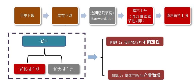 数据来源:OPEC,诺亚研究 从图表能看出卡塔尔的断交对于原油减产的直接影响程度比较有限,市场普遍认为这一事件对于后期OPEC各国间的减产协同性预期会产生一定的分歧,但从另外一个乐观的角度来看,集体“嫌弃”卡塔尔或许让其他国家一致性有所加强,“Every coin always has two sides.(一枚硬币总有两个面。)”这句话不会错的。整体来看,这一事件对于后期原油价格影响较为中性,那么核心影响因素是什么? 接下来,看一下当前原油市场纠结的现状。先端上一张逻辑路径图,这个逻辑路径其实只要在一定程度上参与公开市场交易的都不会太陌生。