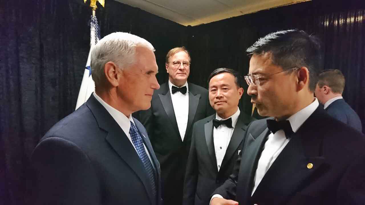 图一:美国副总统Mike Pence先生同海航集团副董事长兼首席执行官谭向东先生 谭向东表示:“我很高兴有机会同美国副总统Mike Pence先生讨论海航集团在美发展战略,表达了海航集团在美国创造新就业机会的承诺,以扩充我们在美遍布多地、共计45000名员工的团队”。