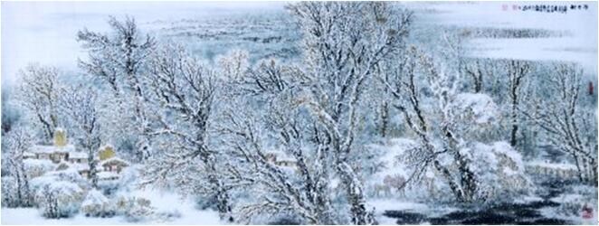 虽然苍天仍有狂风大作、飞雪满天、奇寒刺骨、举步维艰的“变脸”之时,但更有“喜笑颜开之日。若稍加留意,你就会观察到:雪后初晴,万物皆白,一树银花,美玉铺地,真是如入人间仙境。这是南方的任何一处胜境都不能比拟的。杜晓波正是怀着对故土的深情,融心魂于玉洁冰清的雪乡之中.发现了雪原景观的自身之美和它的审美价值,并倾注了几十年的心血开拓雪野、雪山、雪树、雪村的北国风光,创造了~幅又一幅的雪域的风情画卷,表达自己对改革开放后北方山村的雪乡人文景观的时代感受。这是“雪景山水”走向当代的新的境界,这是北方地域特征的再创造。杜晓波的画真正表现了东北地区特有的雪域景观之美,创造了“雪景山水”由传统走向现代的新的领域。