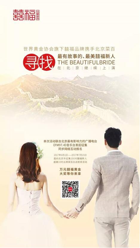 本次“寻找最感动北京爱情故事之最美囍福新人”的征集活动,囍福将携手北京菜百首饰,同时联合北京最有影响力的广播电台《FM97.4》北京音乐台,及众多知名新媒体共同发起。 届时,将会在全北京地区,寻找100对囍福新人,送上由菜百及囍福精心制作的“囍福婚书”和“囍福金箔”。同时,将邀请囍福专家团和媒体共同评选出10对新人,前来参加2017年7月15日在北京菜百总店举办的颁奖典礼,最终选出一对北京囍福新人,送上价值两万元的囍福黄金产品一套。