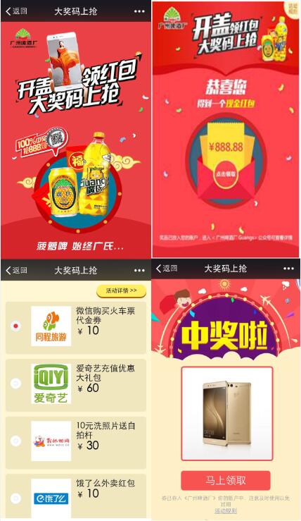 据悉,此次活动只限定在中国境内(港、澳、台地区除外),综合中奖率为100%!活动奖品除了华为P9手机大奖,888元的微信现金红包之外,还有包括微信购买火车票代金券、爱奇艺充值优惠大礼包、10元洗照片送自拍杆、饿了么外卖红包等联盟券好礼。其中,华为P9手机大奖仅设定在廣氏菠萝啤果味饮料480ML产品中。活动所有奖品仅限定在标注有“开盖抢红包,大奖码上抢”及“促销装”字样的产品中,一瓶一码,福利享不停!快快来参加吧! |