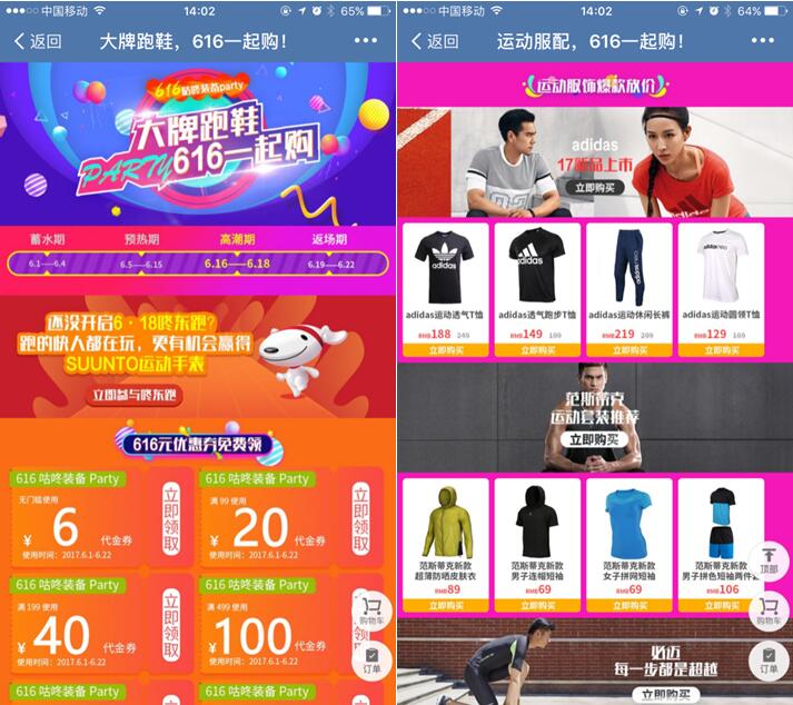 咕咚“616装备Party”,首推的品类是名牌跑鞋,这和咕咚用户当中大量跑友的日常运动需求密切相关。除了咕咚智能跑鞋RF的“预热先火”,咕咚自有品牌的速干T恤、耐力护腿、赛事背包等产品,与大牌生产线合作OEM,品控让人放心,加上优惠券的动心折扣,也是抢手货。