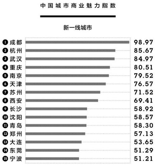 前不久,第一财经旗下的 “新一线城市研究所”发布了《2017中国城市商业魅力排行榜》,以商业资源集聚度、城市枢纽性、生活方式多样性和未来可塑性等五个指标,对全国338个城市重新分级,最终选出了15个“新一线”城市,分别是:成都、杭州、武汉、南京、重庆、天津、苏州、西安、长沙、沈阳、青岛、郑州、大连、东莞、宁波。